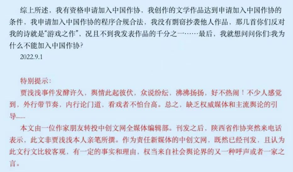 就是网传的《贾浅浅:给我个理由,我为什么不能加入中国作协》一文,也是已退出陕西作协、现供职于北京某出版公司的作家吴琼所写,并非贾浅浅手笔。