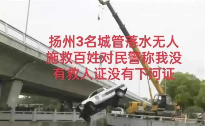一辆城管车不慎冲破护栏坠河,三名城管落水,生命岌岌可危,但周围群众无人见义勇为伸出援手。