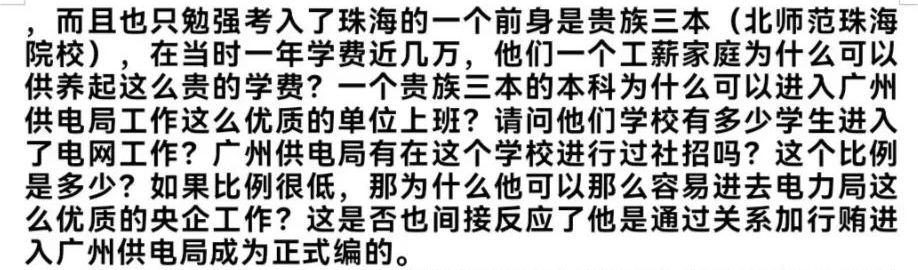 另外还称,同批入职人员约有一半是关系户,或通过“送钱”进入供电局。
