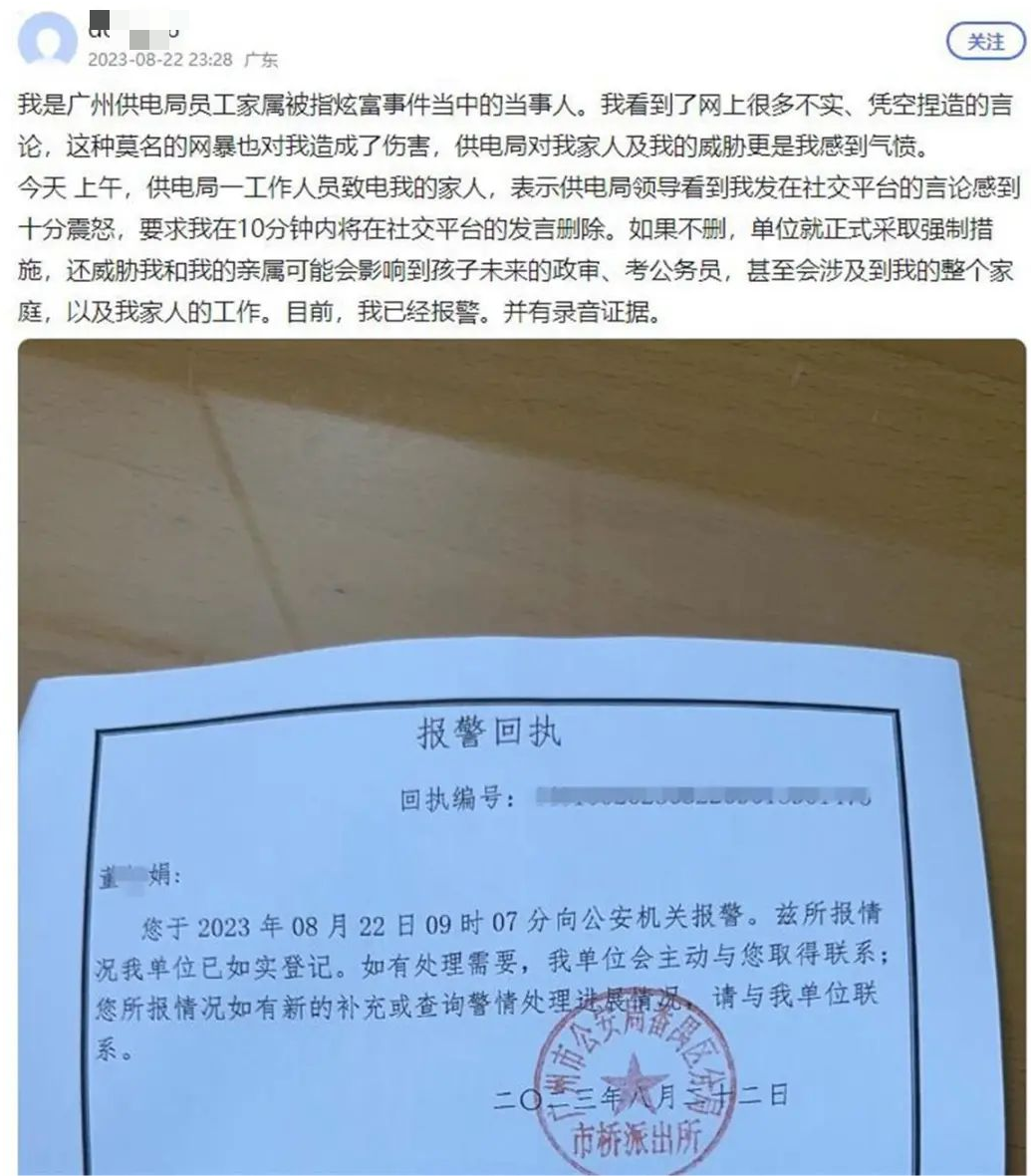 广州供电局工作人员也回复称,网传信息有不实的地方,已经报案,之后将针对此事发布通报。