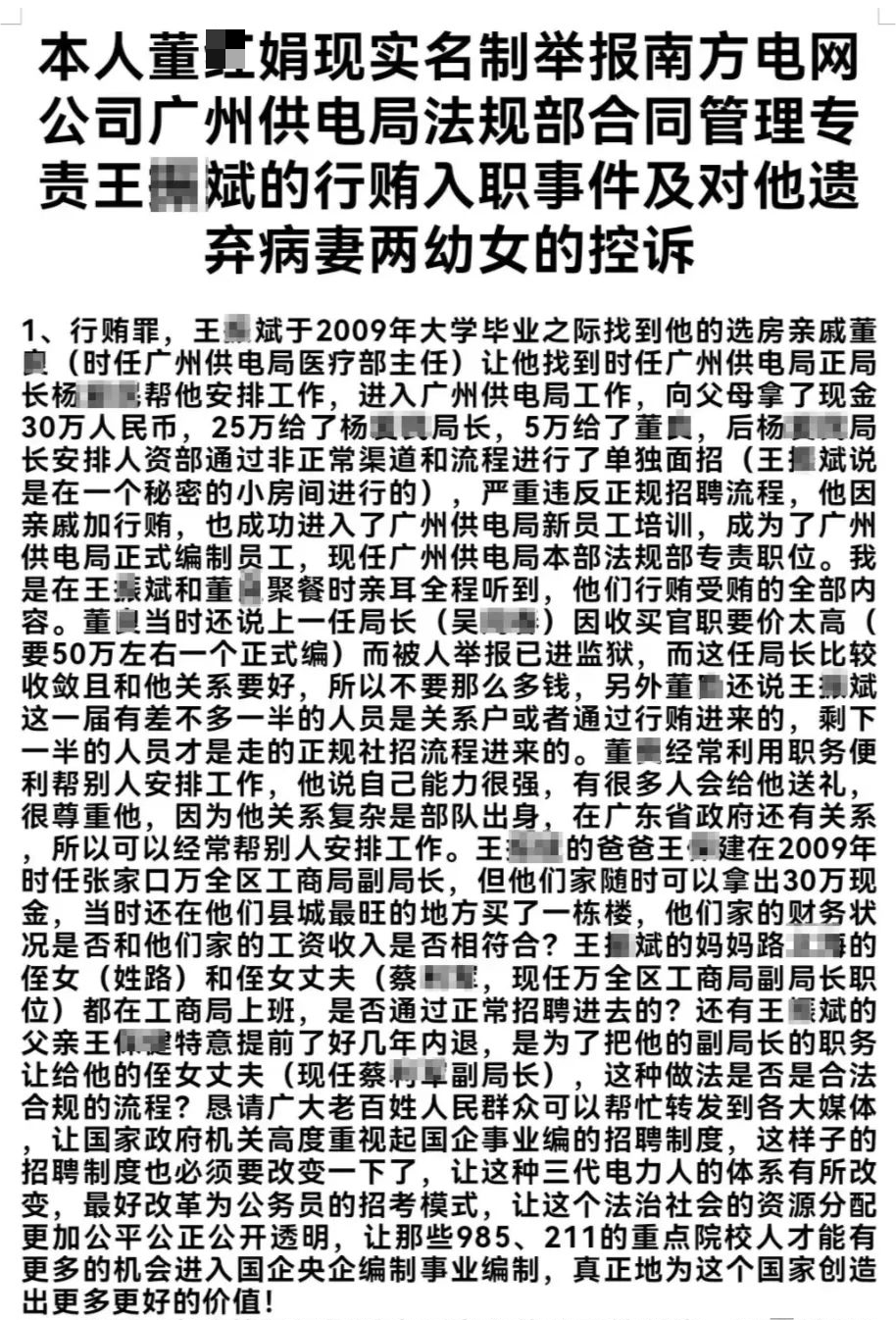 举报称,王某斌2009年毕业后,通过在广州供电局医疗部当主任的亲戚董某,送给广州供电局时任局长杨某民25万元,同时给了董某5万元“搭桥费”。