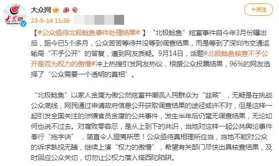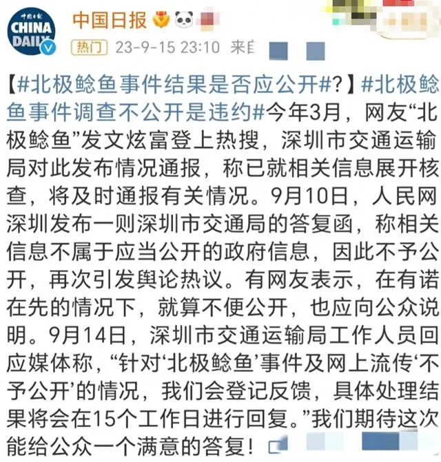 央媒都发话了,得有个态度。9月14日深圳官方表示,针对“北极鲶鱼”事件和网上流传“不予公开”的情况,将在15个工作日内回复。