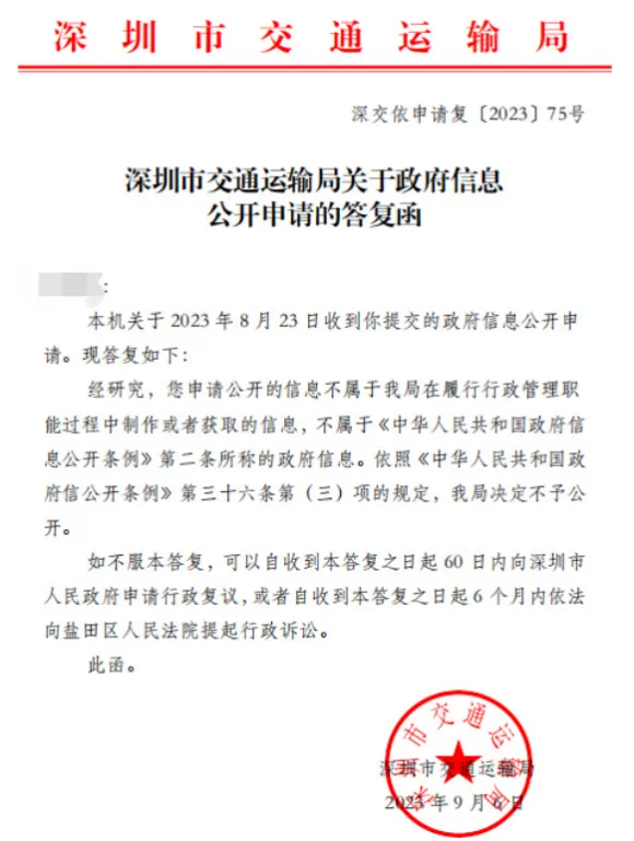9月10日,总算有情况了,然而结果却是 —— 深圳市交通运输局出了份“不予公开”的答复函,说如果不服,可申请复议。
