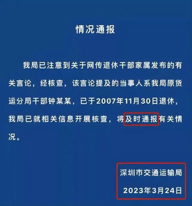 同日,有媒体报道,深圳市纪委监委派驻第二纪检监察组,正在对原深圳市交通局货运管理分局局长钟某赐的有关问题调查核实。
