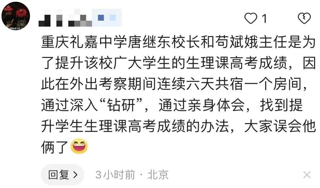 近日网友爆料,重庆礼嘉中学领导在酉阳学习考察期间,唐继东和苟斌娥同宿一房过夜。
