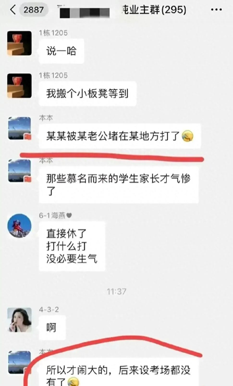 视频时间是6月18日那几天,但9月份才曝出来,起初是发布到某小区业主群。群里有人聊到,唐校长曾被苟主任的老公堵住打了一顿。