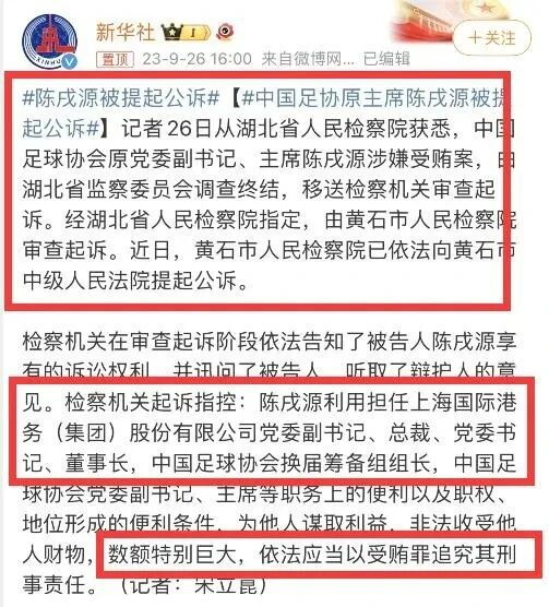 9月末,中国足协原主席陈戌源被提起公诉,指控罪名是: