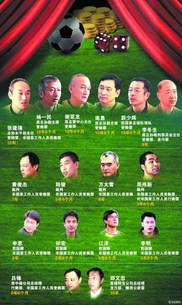 南勇、谢亚龙分别涉案120万、130万,均被判处有期徒刑10年6个月;时任足协裁判委员会秘书长张建强涉案270万,被判处12年有期徒刑。