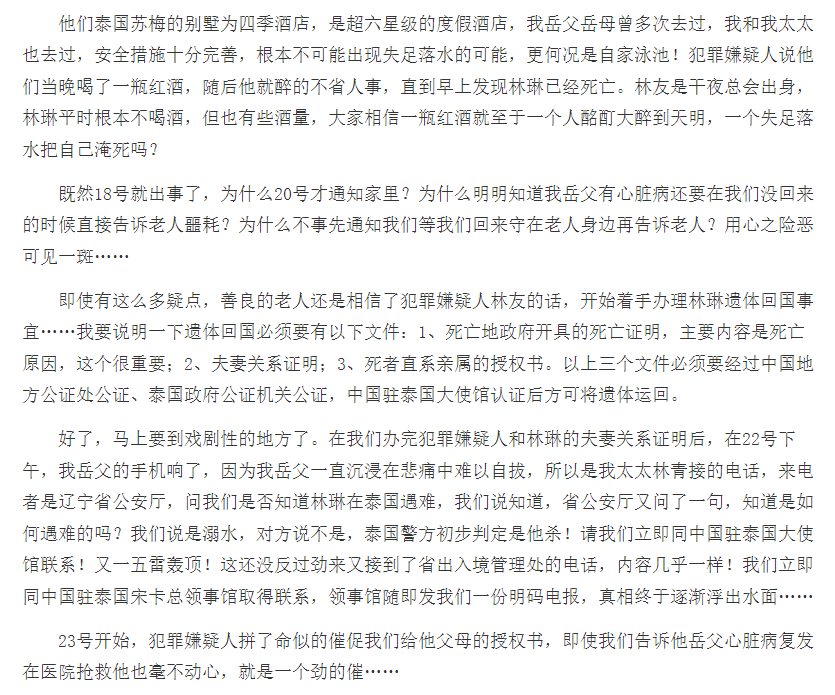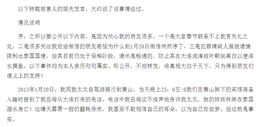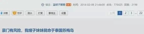 2014年初,网友“蓝胡子舅舅”在某涯网站发了一个帖子——“豪门有风险,我嫂子妹妹毙命于泰国苏梅岛”。