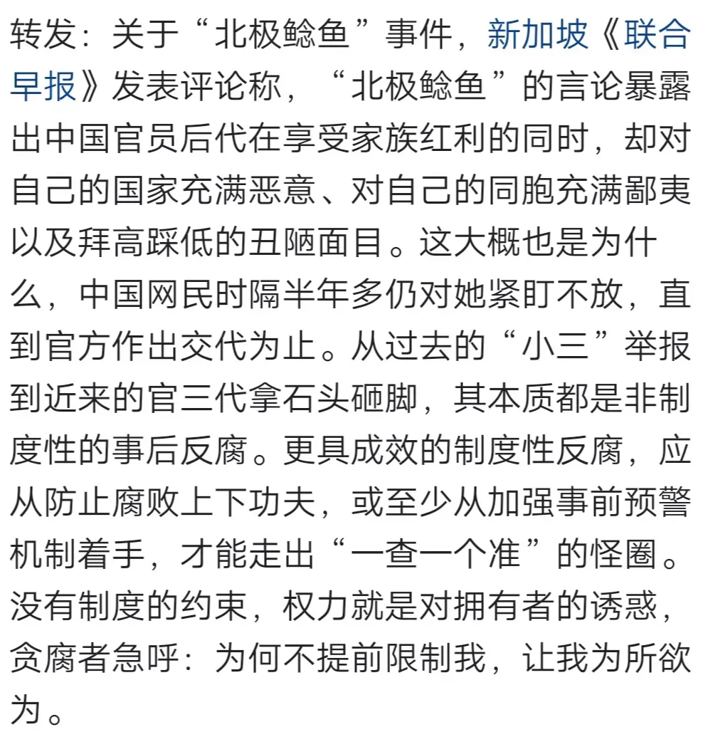 “北极鲶鱼的言论暴露出中国官员的后代享受家族红利的同时,却对自己的国家充满恶意,对自己的同胞充满鄙夷以及拜高踩低的丑陋面目。”