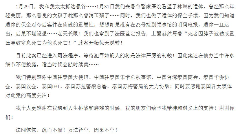 泰国警方因林友有重大嫌疑逮捕了他,但林友方面花100万保释,之后警方以失足溺水而死结案。