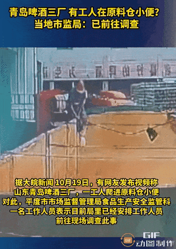 一段疑似事发地为青岛啤酒三厂的视频显示,身穿蓝色工服头戴安全帽的一名男员工,矗立在酿酒原料堆旁,拉开拉链,大气磅礴酣畅淋漓地来了场“人工降雨”。