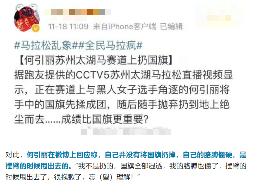 还有人联系到2018年苏州马拉松赛,中国女选手何引丽冲刺中本处于领先位置,被两名志愿者两次强递国旗,导致何引丽被严重干扰节奏,肯尼亚选手趁机反超,何引丽痛失冠军。