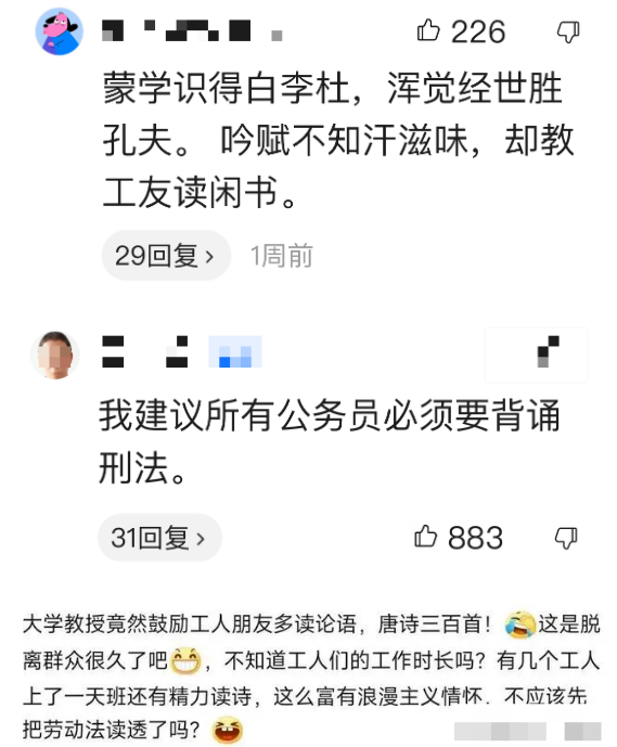 这也正说明,现在的工人有独立思考能力,敢于发表自己的观点和意见,尽管揶揄非议居多,蒙曼教授想必也是欣慰的吧。