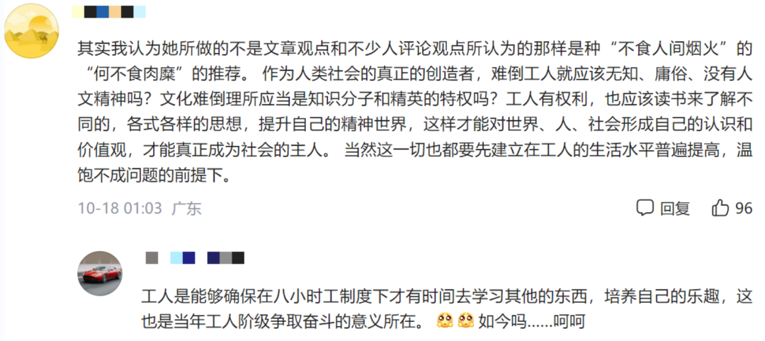 她脱离群众太久了,工人一天累死累活,回到家恨不得倒头就睡,能刷刷手机就算陶冶情操了,哪还有看书的闲情逸致?