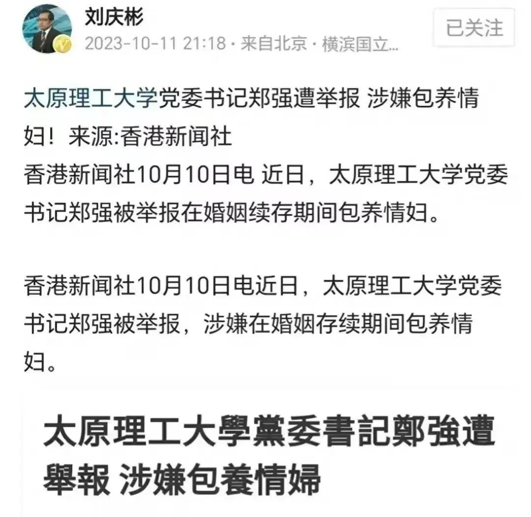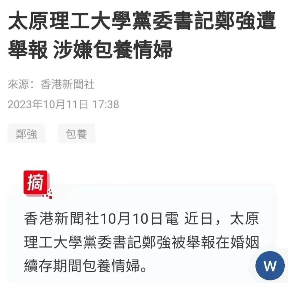 太原理工大学党委书记郑强,被举报在婚姻续存期间包养情妇。