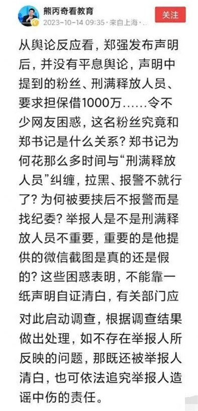 “隐隐感觉有内情,你想想,一般粉丝能联系上郑强本人?郑强一直强调对方是刑满释放人员,而没有实质性反驳,难道刑满释放人员就不能举报了?”
