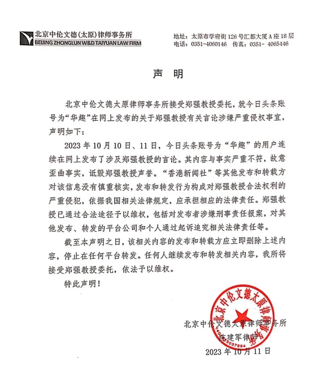 但是,当舆论的风浪愈演愈烈,郑强选择通过法律途径,为自己争取一个清白。他委托“北京中伦文德太原律师事务所”为他发表严正声明。