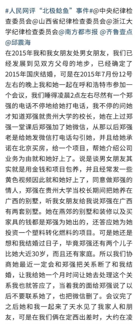 报道中写到,一位网名为“华趣”的网友,发文称郑教授“在2015年任贵州大学校长的时候,包养了他的女朋友。”