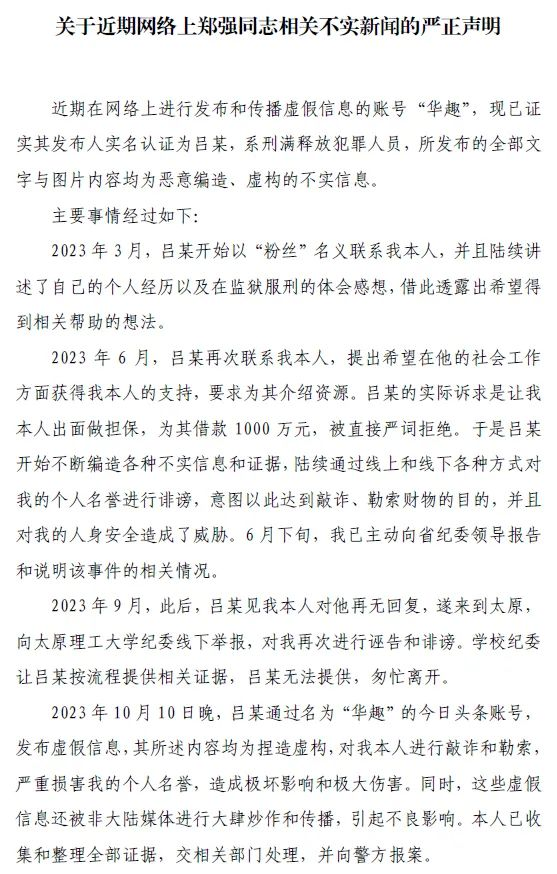 10月12日,郑强在个人公众号上发布声明,称上述事件是网友吕某恶意编造、传播谣言。
