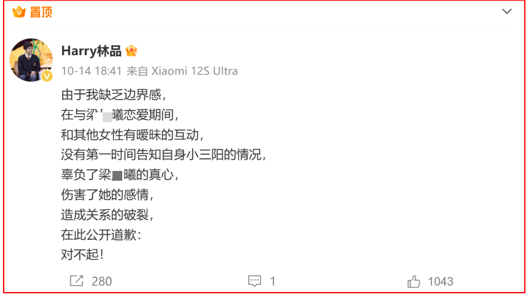 之后林品发贴回应,称自己因为缺乏边界感,在与梁某曦恋爱期间和其他女性确实存在暧昧互动,辜负了梁某曦的真心,伤害了其感情,对此他表示歉意。