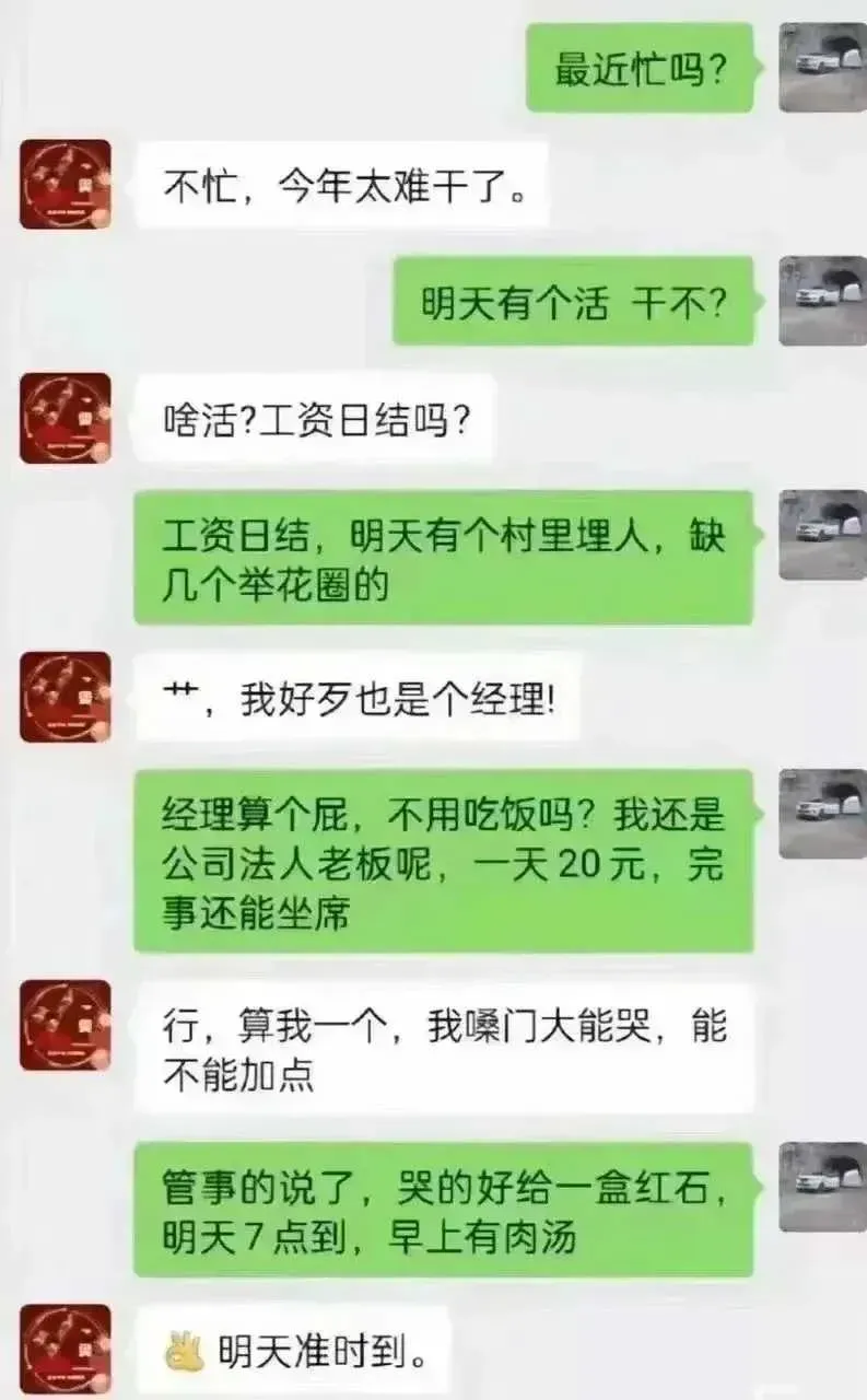 看里面的意思,好像举花圈的活还挺抢手,去晚了不一定捞得着。