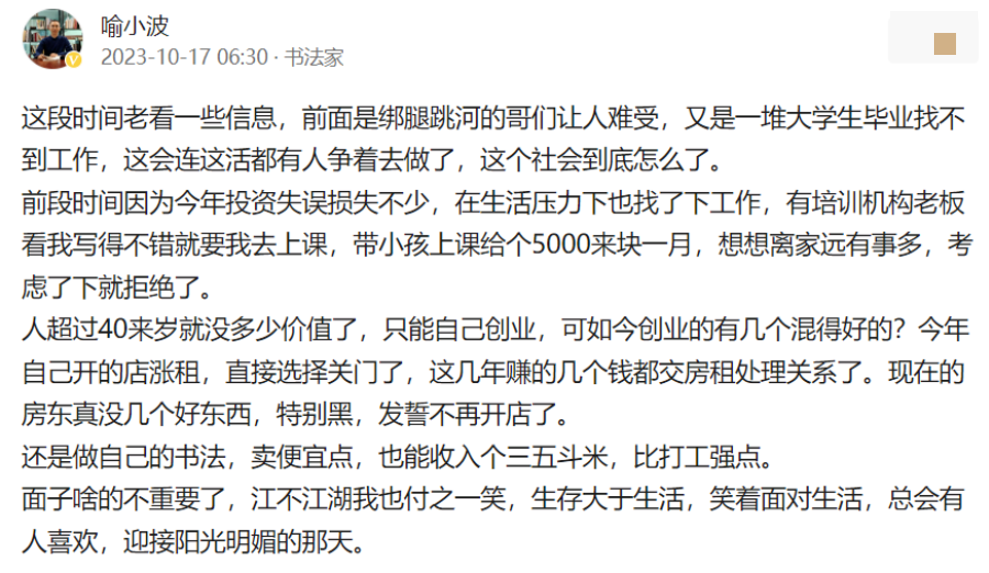 这几年,看到过或听到过因种种原因,做营生不景气的现象,倒闭关门的,老板去开滴滴的,被亏损或债务压垮的,都有。