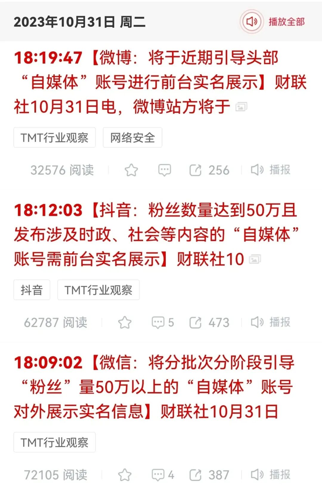 10月31日,微信、微博、抖音、快手、百度、b站、今日头条等平台发布公告: