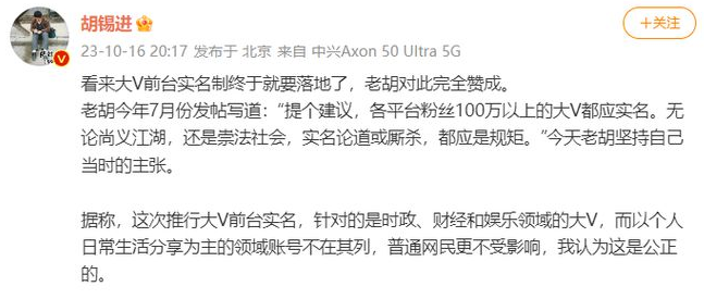 “不管是谁,不管粉丝多少,每一个自媒体用户都应该前台实名。”