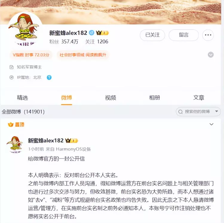 大V“新蜜蜂alex182”的态度较有代表性,他给微博官方写了一封公开信,强烈反对前台实名制,说宁可注销账号也不想被实名。