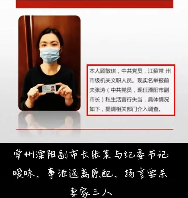 “本人顾敏琪,中共党员,江苏常州市级机关文职人员。现实名举报前夫张涛(中共党员,现任溧阳市副市长)私生活言行失当,具体情况如下,提请相关部门介入调查。”