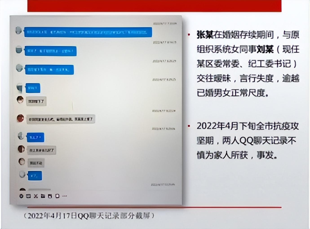 视频中顾女士称,张某在婚姻存续期间与原组织系统女同事刘某(现任某区委常委、纪工委书记)交往暧昧,言行失度,逾越已婚男女正常尺度。