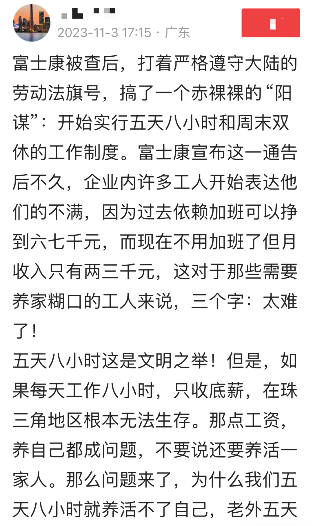 也有不少自称富士康方面的员工,在社交平台上驳斥了“实行双休”等说法,称“正在加班,并无双休”。