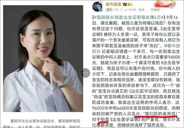 我举报该院长涉嫌贩卖出生证,贩卖疫苗本,贩卖婴儿的问题,全部属实,目前他们已经查获多起贩卖婴儿的违法犯罪事实。”
