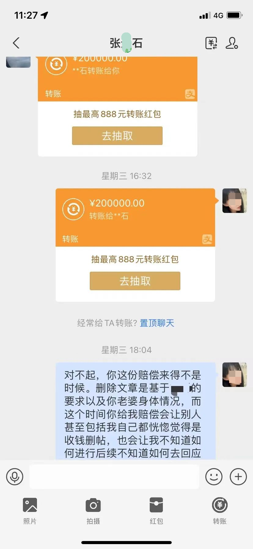 我非常难过,我并不是因为这20万收手,同时我又觉得他给我赔偿是天经地义的事情。但他这个时候给我转钱,明显不合适也让我很难自处。