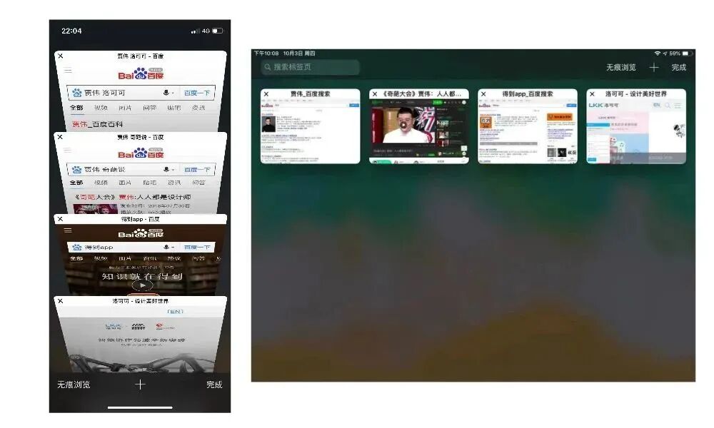 比如说,苹果手机的浏览器标签页有一个三维堆叠效果,像是拉开抽屉看里面的文件,一目了然,很酷炫。但是到了iPad端,它把这个设计舍弃了,而是用了简单的平铺方式。