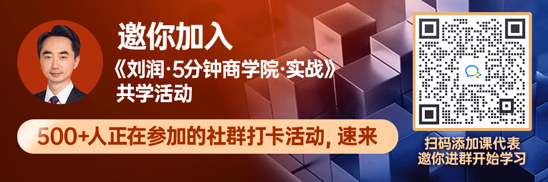 如果你想了解更多商学知识,看清商业逻辑背后的本质,欢迎扫描下方二维码,加入《刘润·5分钟商学院·实战》学习社群,与得到同学一起打卡共学。