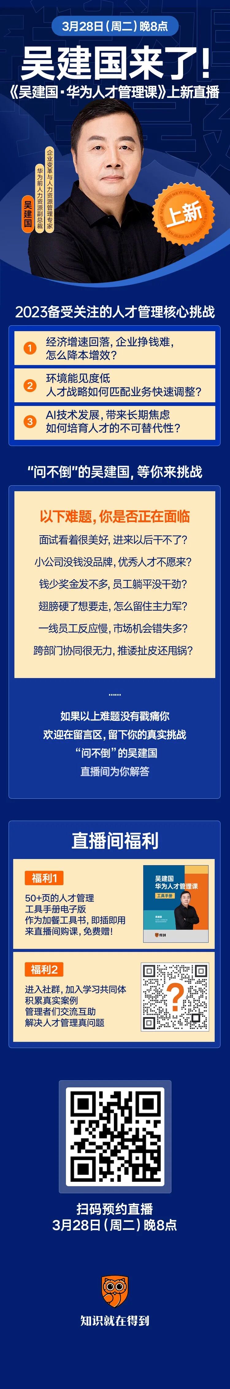 3月28日(周二)晚8点,华为前人力资源副总裁吴建国将来到得到直播间,帮你破解人才管理相关难题,感兴趣的同学别错过!
