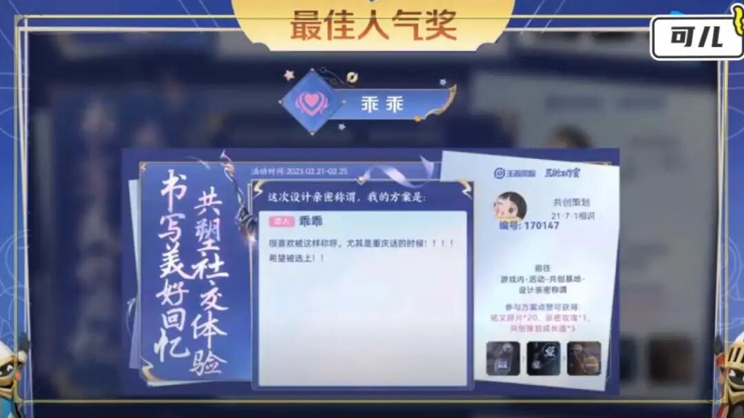 然后就是玩家共创的亲密度称号,也公布了几款比较优秀的方案,其中人气最高的方案是乖乖,是属于恋人中的一个称号。