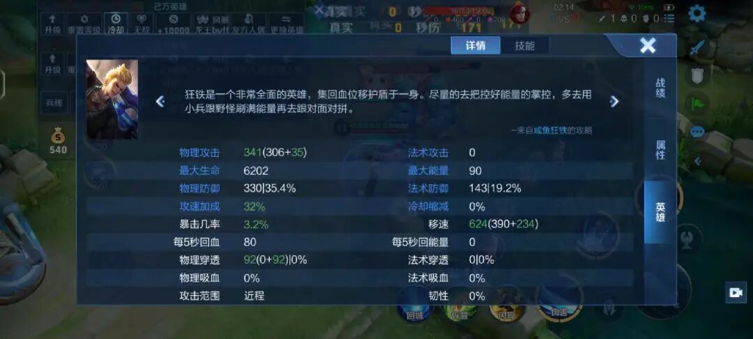 狂铁这个英雄的优点很多,对线能力强,前期可以压制大多数对抗路英雄,并且伤害也高,两级一套技能可以打三分之二的血。还自带续航,并且不需要蓝条,即便是残血也不用回家,顺风的狂铁,一个人打两个完全不成问题。