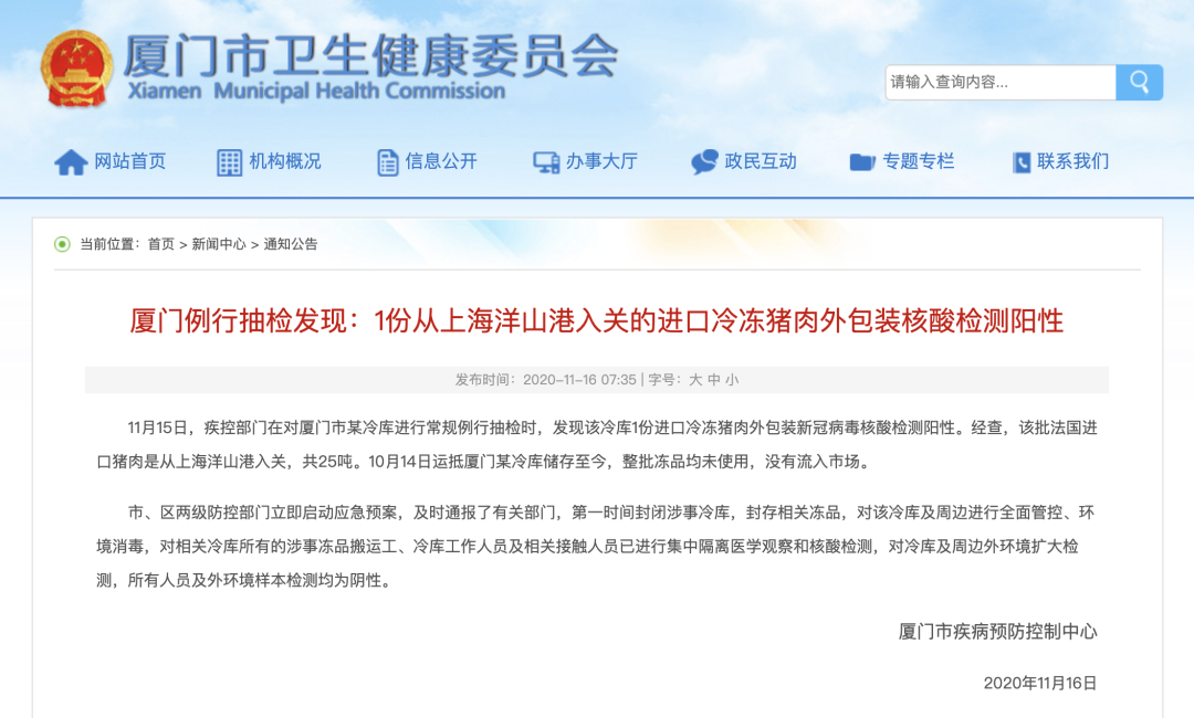 据厦门卫健委今早(11月16日)刚刚通报,11月15日,疾控部门在对厦门市某冷库进行常规例行抽检时,发现该冷库1份进口冷冻猪肉外包装新冠病毒核酸检测阳性。