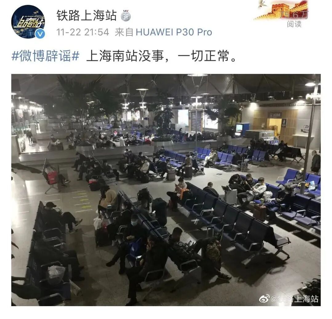 当日,一则“上海南站出现突发状况”的传言也在社交媒体传播。传言称,上海南站工作人员“让乘客赶紧回家”。对此,铁路上海站官方微博辟谣称,上海南站没事,一切正常。同时,官微配发了一张候车室照片,显示不少乘客正坐在椅子上候车。