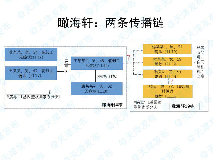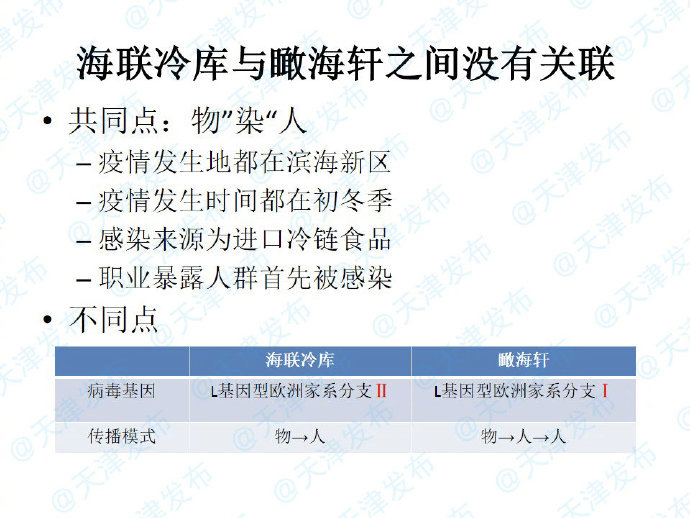 发布会上,天津市疾控中心副主任张颖介绍海联冷库与瞰海轩的疫情没有关联性,是两起独立的发病。判断的依据不单纯是从地理位置、人员的联系,更重要的是病毒的基因。