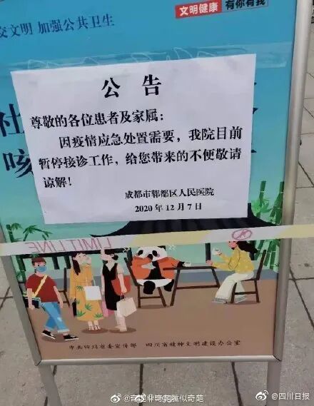 12月7日上午,网传成都市郫都区人民医院发现新冠病例患者,医院已暂停接诊工作。记者随即致电医院询问情况。医院工作人员在电话中表示,因疫情应急处置需要,医院7日清晨即暂停接诊工作,具体原因将会发布相关通知。