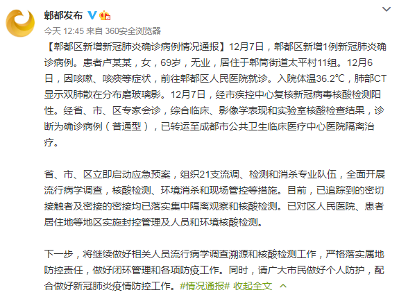 据通报,12月7日,郫都区新增1例新冠肺炎确诊病例。患者卢某某,女,69岁,无业,居住于郫筒街道太平村11组。12月6日,因咳嗽、咳痰等症状,前往郫都区人民医院就诊。入院体温36.2℃,肺部CT显示双肺散在分布磨玻璃影。12月7日,经市疾控中心复核新冠病毒核酸检测阳性。经省、市、区专家会诊,综合临床、影像学表现和实验室核酸检查结果,诊断为确诊病例(普通型),已转运至成都市公共卫生临床医疗中心医院隔离治疗。