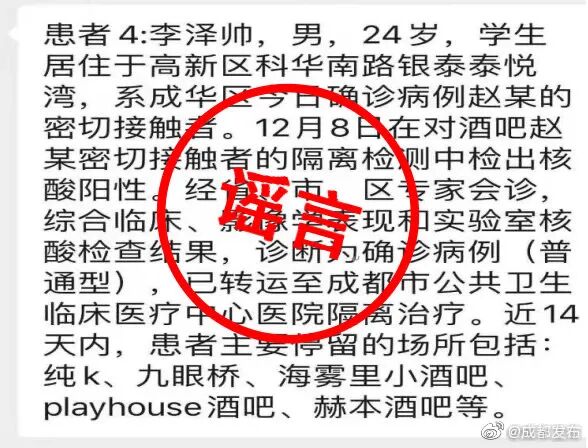 今天(12月8日),不少网友在朋友圈、微博等社交平台发布信息称,“李泽帅,男,24岁,学生居住于高新区科华南路银泰泰悦湾,为成华区确诊病例赵某的密切接触者……”
