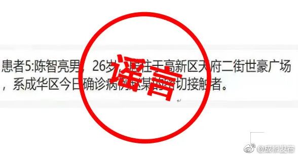 今天(12月8日),朋友圈、微博等社交平台流传着这样一则消息:成都高新区世豪广场一26岁男子陈某亮为确诊病例赵某的密切接触者。记者从高新区世豪广场物业工作人员处了解到,该名男性确实为物业中心的工作人员,但网上所传截图均为谣言。发现问题后,他们也在积极配合社区进行调查,未发现陈某亮去到过确诊患者所去过的相关区域,请大家不信谣,不传谣。