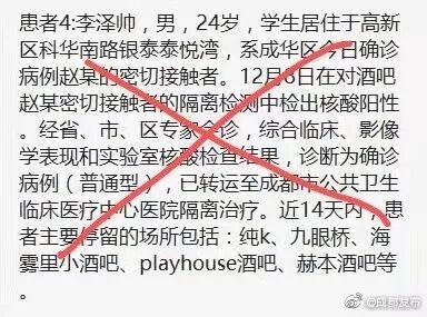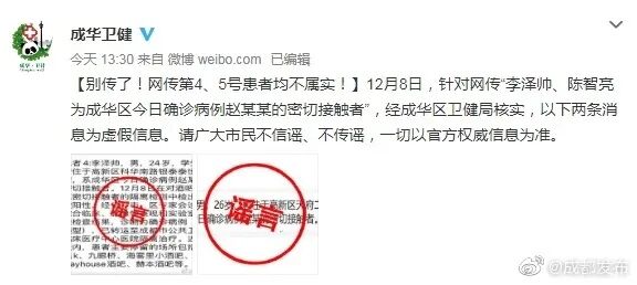 据@成华卫健 官方消息,今天(12月8日),针对网传“李泽帅、陈智亮为成华区今日确诊病例赵某某的密切接触者”,经成华区卫健局核实,以下两条消息为虚假信息。请广大市民不信谣、不传谣,一切以官方权威信息为准。