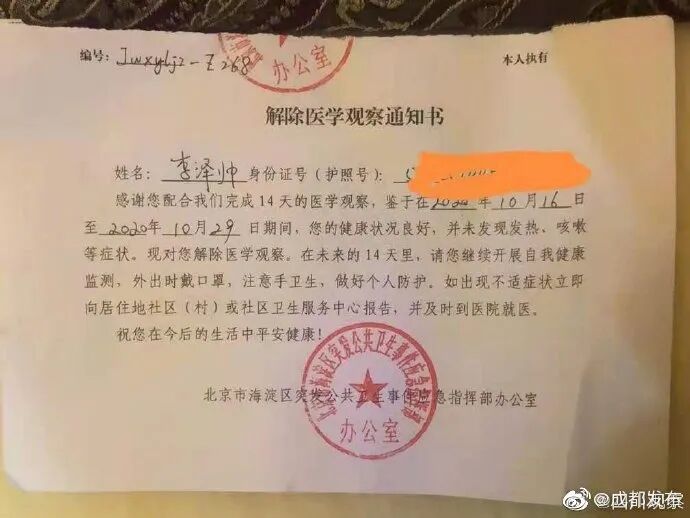 经核实,关于李泽帅确诊的信息不实。据了解,李泽帅21岁,2020年10月16日从加拿大回北京,10月16号至10月29号在北京集中隔离14天后,又在北京待了10天,于11月8日晚上从北京回到泰悦湾小区,均有核酸检测报告及隔离证明。11月8日至12月5日期间并未去过上述地区活动,并于12月6日凌晨4点多开车至南充,目前在南充回成都的高速上。泰悦湾物业已经联系社区工作人员,等他回成都后,对其进行核酸检测。请各位网友不信谣、不传谣!