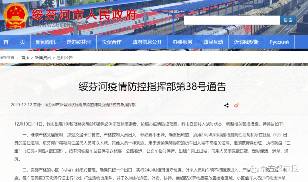 12月10日—11日,绥芬河市出现1例新冠肺炎确诊病例和2例无症状感染者。按照绥芬河疫情防控预案,绥芬河立即转入战时状态,调整相关管控措施,特通告如下: